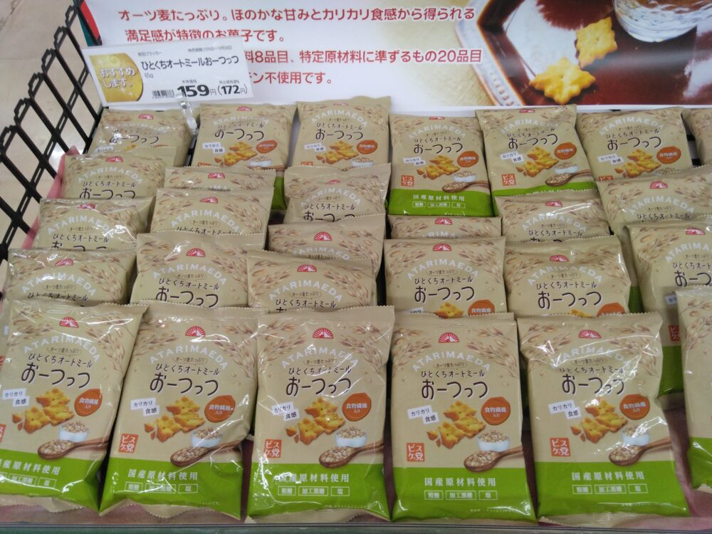 こんにちは八束店です。本日はお菓子部門のひとくちオートミールおーつっつを紹介します。パリパリ食感でおいしいお菓子です。ぜひどうぞ!