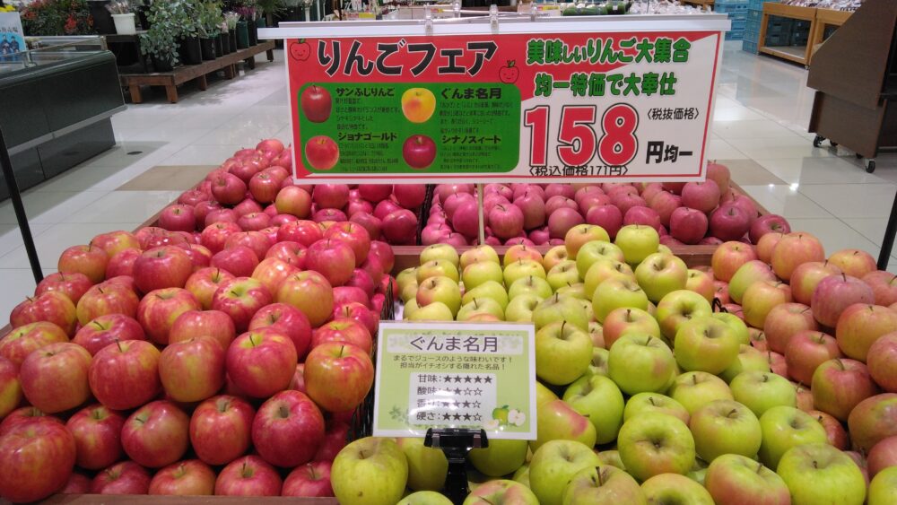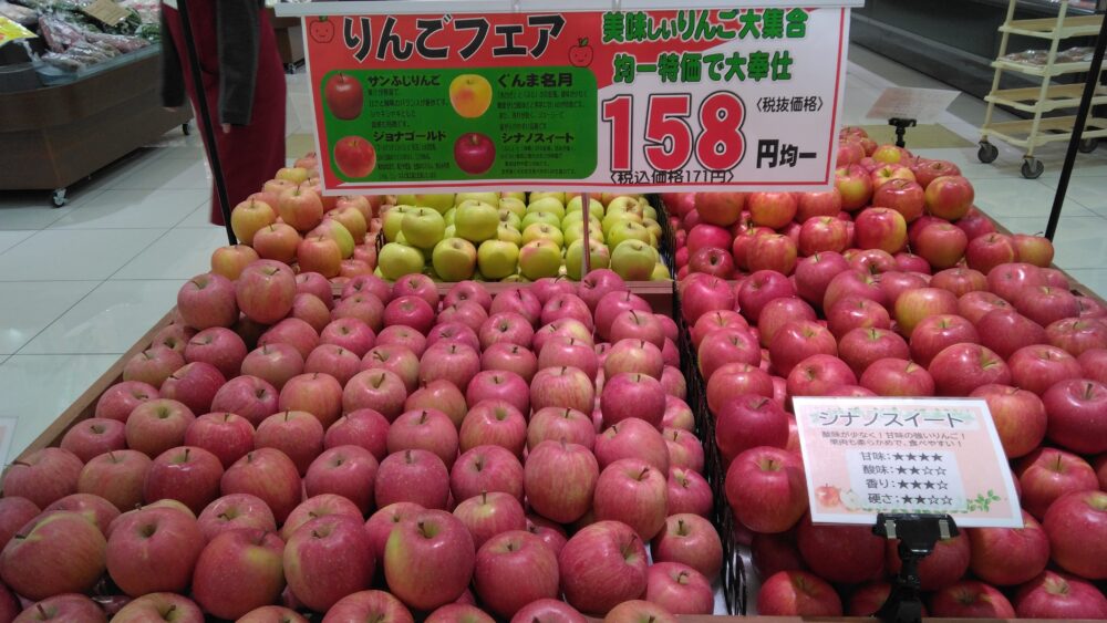 東川津店本日はりんごがお買い得!今美味しいりんごを揃えました。食べ比べ等いかがでしょうか?