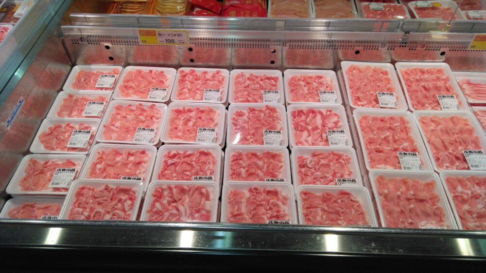 こんにちは!みしまや上の木店です。本日のおすすめは国産豚ロースうす切りです。本体価格198円(税込214円)ととてもお買い得です!野菜と一緒に炒め物などいかがでしょうか?ぜひお買い求めくださいませ。ご来店お待ちしております!