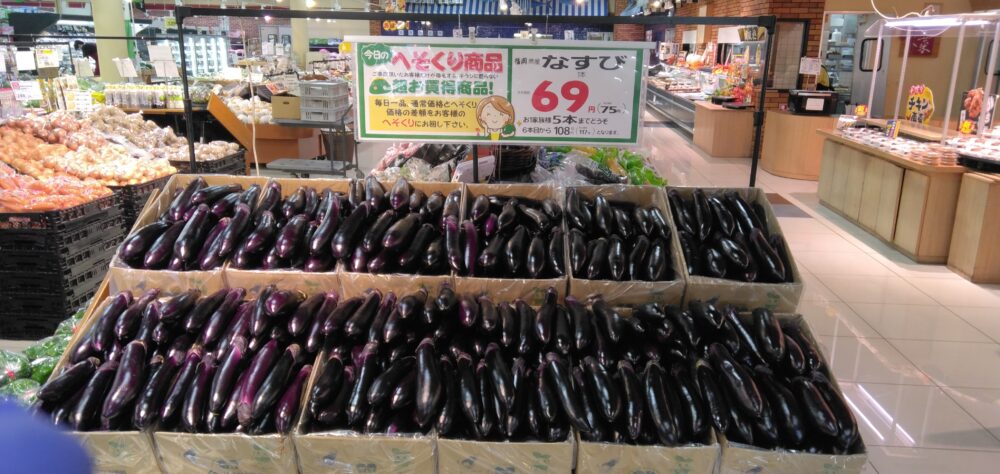 こんにちは、田和山店農産部門です。本日のおすすめはなすびバラ売りです!お好きな本数だけどうぞ!天ぷらや麻婆茄子におすすめします!ぜひお買い求めくださいませ。