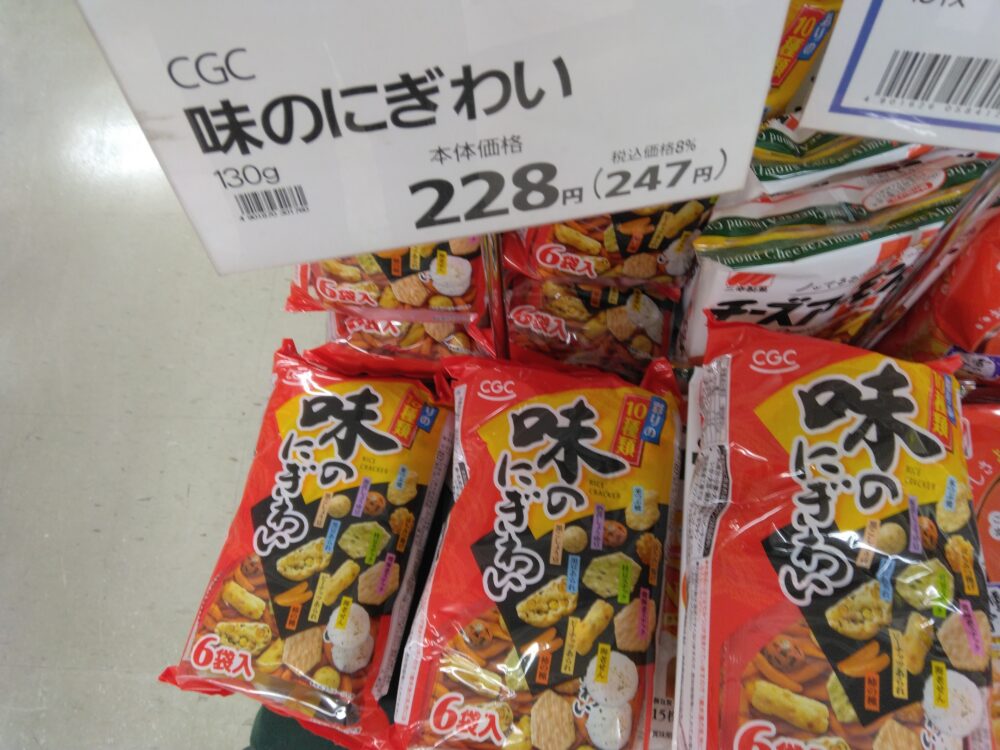 本日のおすすめ商品は、CGC味のにぎわいです。いろいろな味が楽しめます。只今お買い得になっております。おやつに、おつまみにいかがでしょうか。