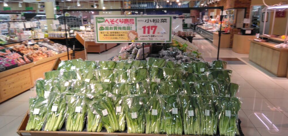 こんにちは、田和山店農産部門です。本日のおすすめは小松菜です!島根県産でございます!炒め物やお味噌汁にいれてみてはいかがでしょうか。ぜひお買い求めくださいませ。
