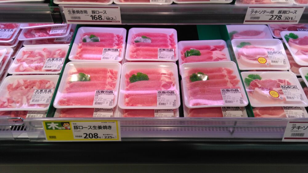 こんにちは!みしまや上の木店です。本日のおすすめは国産豚ロース生姜焼きです。本体価格208円(税込225円)ととてもお買い得です。ぜひお買い求めくださいませ。ご来店お待ちしております!