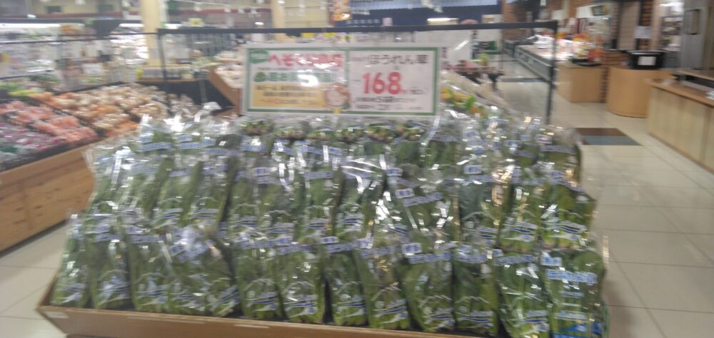 こんにちは、田和山店農産部門です。本日のおすすめはほうれん草です!おひたしやお味噌汁にいかがでしょうか。ぜひお買い求めくださいませ。