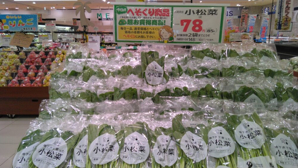 東川津店、今日のへそくりは小松菜です! 小松菜炒めがおすすめ♪ この機会に是非お買い求めくださいませ!