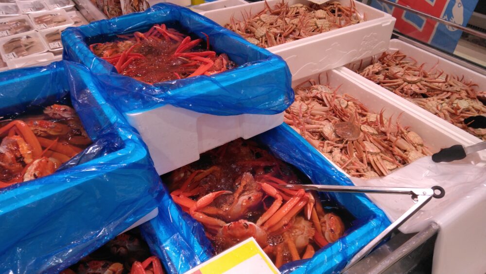 こんにちは!みしまや東川津鮮魚コーナーです!本日は土曜市!鮮魚コーナーではいまが美味しいかにがたくさん!松葉や紅がになどおすきなかにをお選びくださいませ!ぜひお買い求めくださいませ!