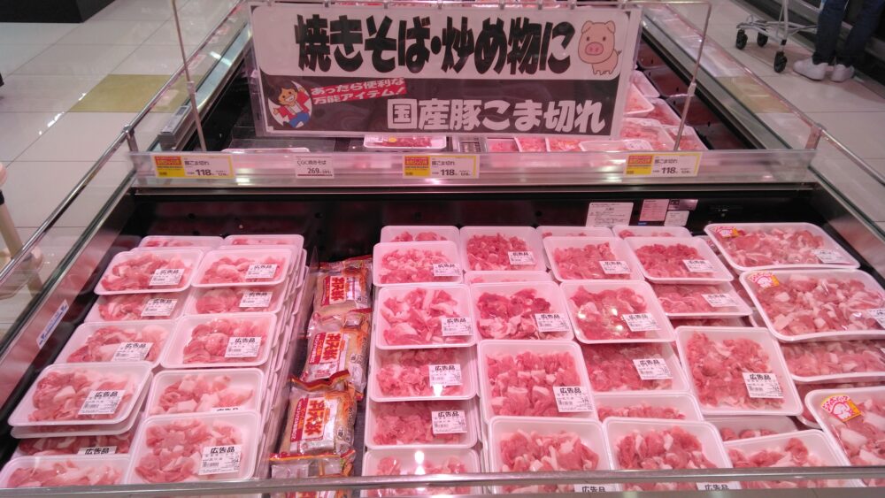 こんにちは!みしまや東川津店精肉コーナーからの本日のおすすめは、国産豚こま切れです。焼きそばや炒め物にぴったりのお肉ですよ♪ぜひ、ご利用くださいませ。