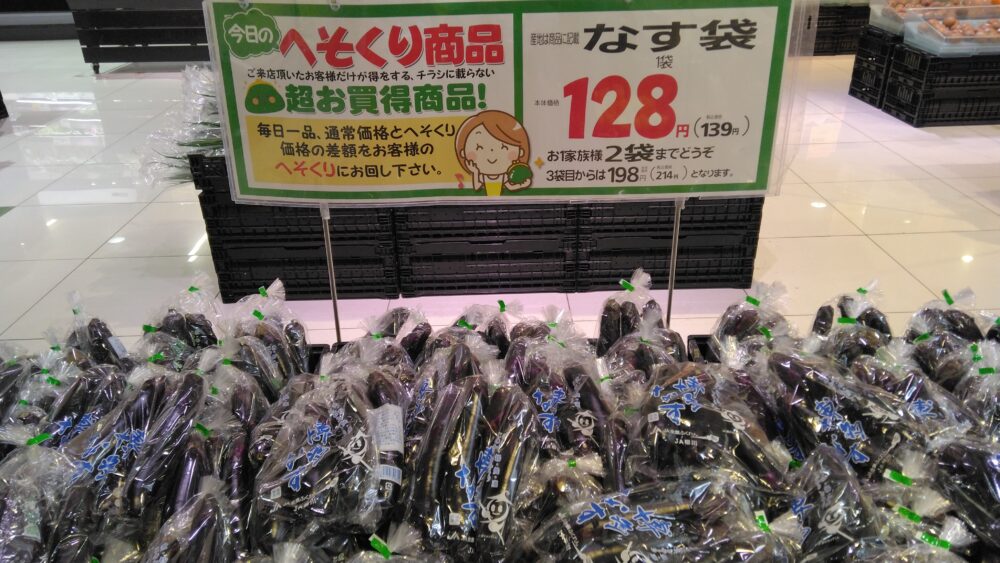 おはようございます!みしまや春日店農産コーナーです。本日のへそくりは福岡県産ナス袋です。寒いので、麻婆茄子を食べて体の中から温まるのはいかがでしょうか!お1家族様2袋まで128円、3袋目から198円です。ぜひお買い求めくださいませ!