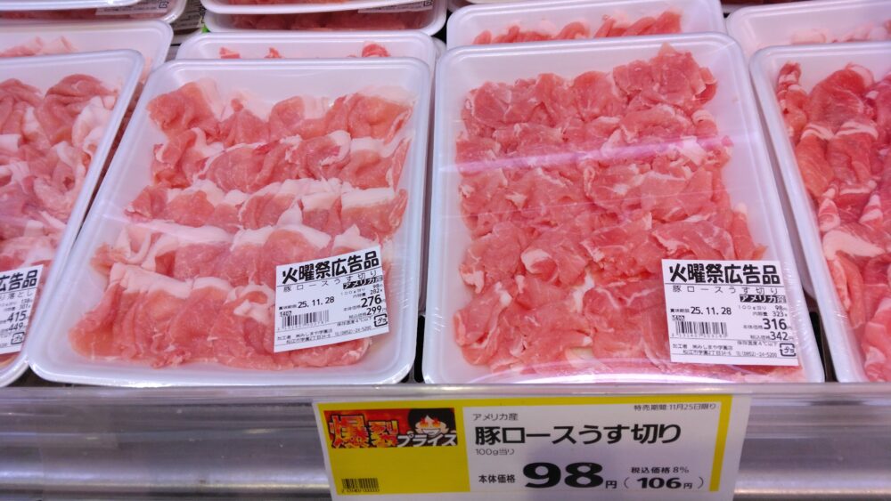 おはようございます!本日の爆裂プライス10品目の中で精肉コーナーからのおすすめ商品は、国産若鶏ムネ肉と、アメリカ産豚ロースうす切りです! その他お買い得商品を沢山取り揃えております。 是非この機会にお買い求め下さいませ。ご来店お待ちしております。