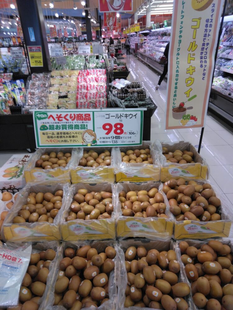 本日はゴールドキウイがお買い得です。そのまま食べたり、ヨーグルトにトッピング、寒天ゼリーなどのデザート作りなどにどうぞ。