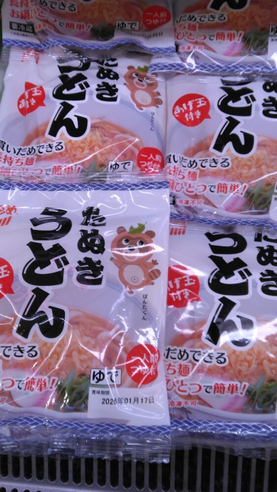 今日の学園店のおすすめ商品は、なかたかのたぬきうどんです。 寒くなったこの時期に手軽に温かいおうどんはいかかですか。揚げ玉とつゆ付きで、お鍋ひとつで簡単便利です。長持ち麺なので常備できます。みしまや学園店で是非この機会にお買い求め下さいませ。