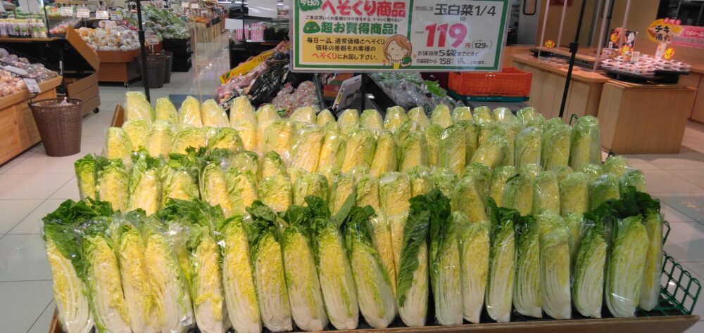 こんにちは、田和山店農産部門です。本日のおすすめは白菜1/4カットです!使い切りサイズで大変おすすめいたします!鍋にいかがでしょうか。ぜひお買い求めくださいませ。