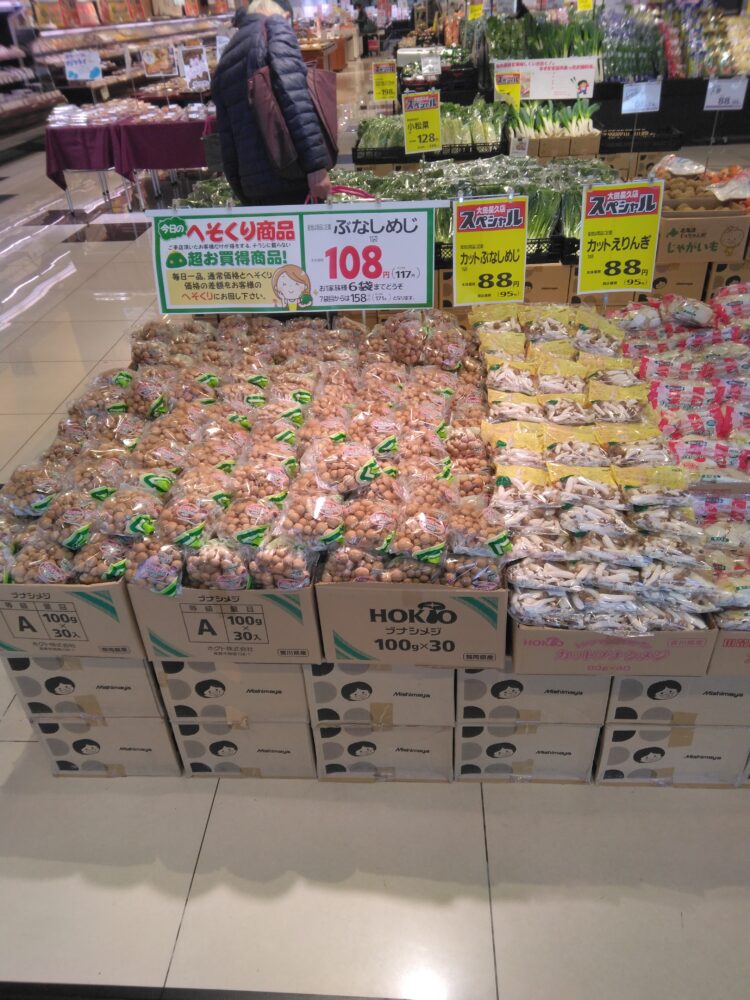 本日はぶなしめじがお買い得です。キノコ鍋やキノコパスタなどにどうぞ。他のキノコも合わせご活用下さい。