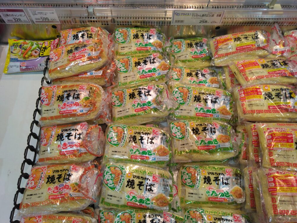 本日のみしまや春日店、日配コーナーからのおすすめ品はマルちゃん焼きそばです!期間限定でカップ麺の赤いきつね味と緑のたぬき味とコラボ中です。おだしの味を感じる、焼きそばをぜひこの機会にお買い求めくださいませ!