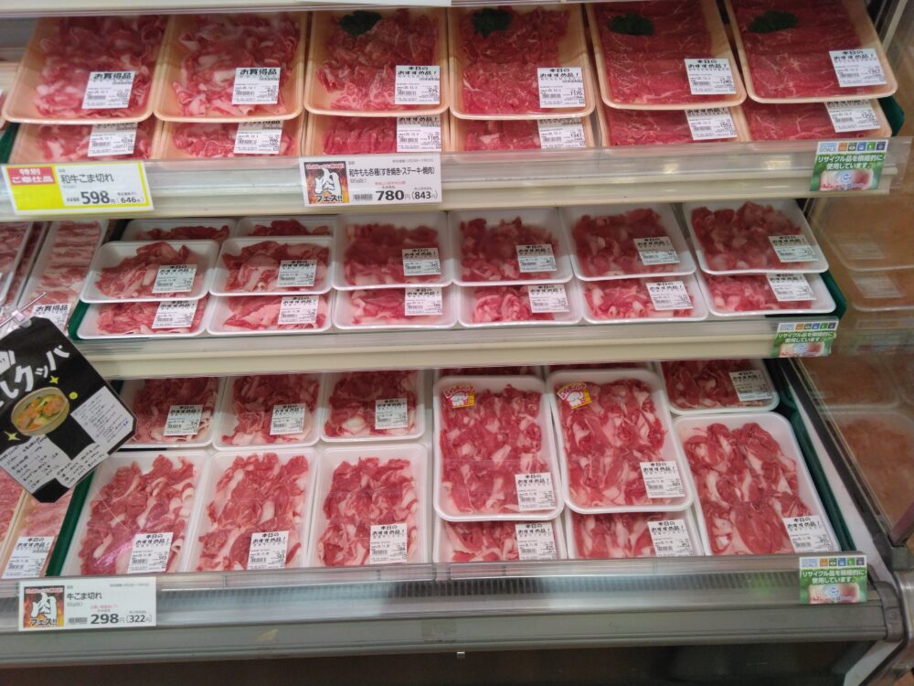 おはようございます!みしまや楽山店です。今日は良い肉の日です!少し奮発して国産牛こま切れはいかがでしょうか?炒め物やカレーなど様々な料理にお使いいただけます。良い肉の日にちなんだ料理のためにぜひともみしまや楽山店にてお買い求め下さいませ!