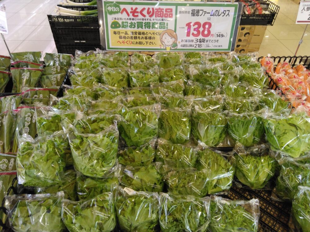 こんにちはみしまや雲南三刀屋店です。 本日のへそくりは福徳ファームのレタスです。 苦味が少ないおいしさで、当店で大人気! ぜひお早めにお買い求め下さいませ!