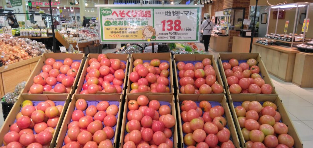 こんにちは、みしまや田和山店農産部門です。本日のおすすめは【地物トマト】です。島根県産のトマトを食べて元気いっぱいです。大変お買い得ですのでぜひお買い求めくださいませ。