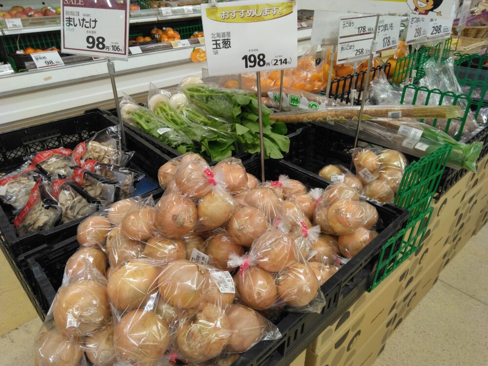 本日は、玉ねぎがお買い得です。炒め物などにいかがでしょうか。ぜひお買い求めくださいませ。