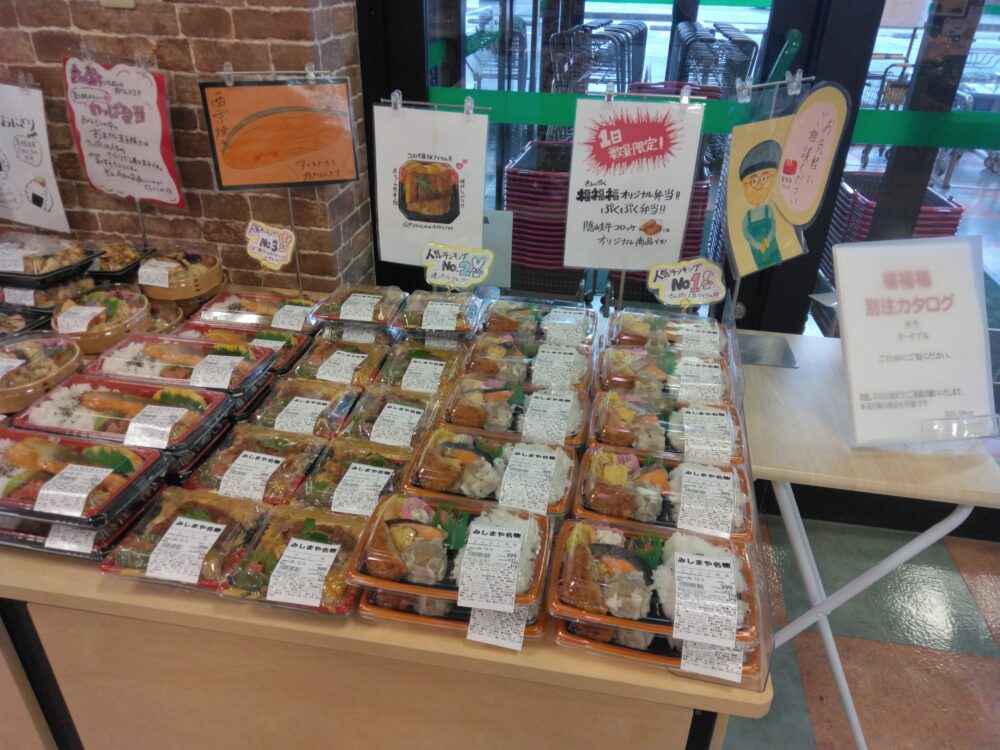おはようございます。 みしまや楽山店福福福では、大人気の『ぷくぷく弁当』を始め、おにぎり、丼他にも多数商品を取り揃えております。 どれも数量限定、人気商品についお早めにお買い求め下さいませ。 また、本日雪や雨で天候が不安定のため、気を付けてお越しくださいませ。