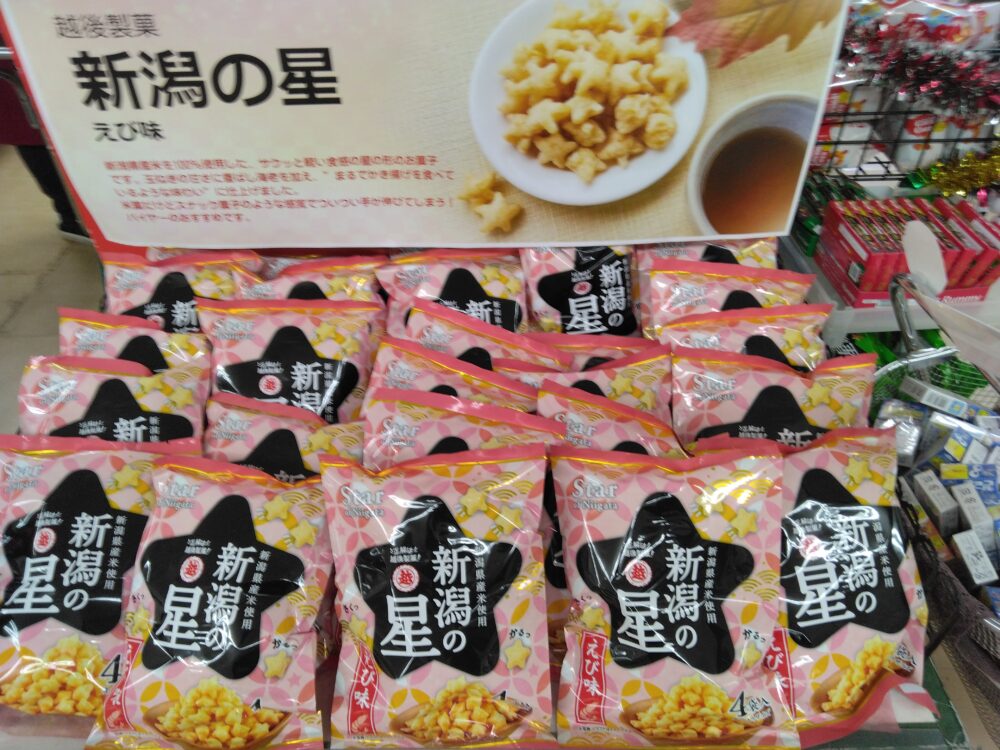こんにちは八束店です。本日のおすすめは新潟の星のお菓子を紹介します。星の形をした可愛いお菓子です。パリパリ食感で抜群です。お茶のおともに、休憩タイムにどうぞ!