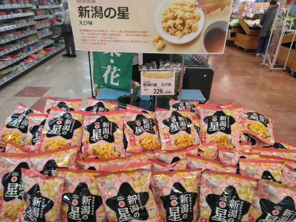 こんにちは、楽山店です。お菓子コーナーから今月のおすすめの「新潟の星」をご紹介! えび味で見た目も可愛い星の形をした米菓で、食べきりサイズの4袋入り。サクッかるっ製法でついつい食べ過ぎてしまいます。お茶口にピッタリです、是非お買い求め下さいませ。