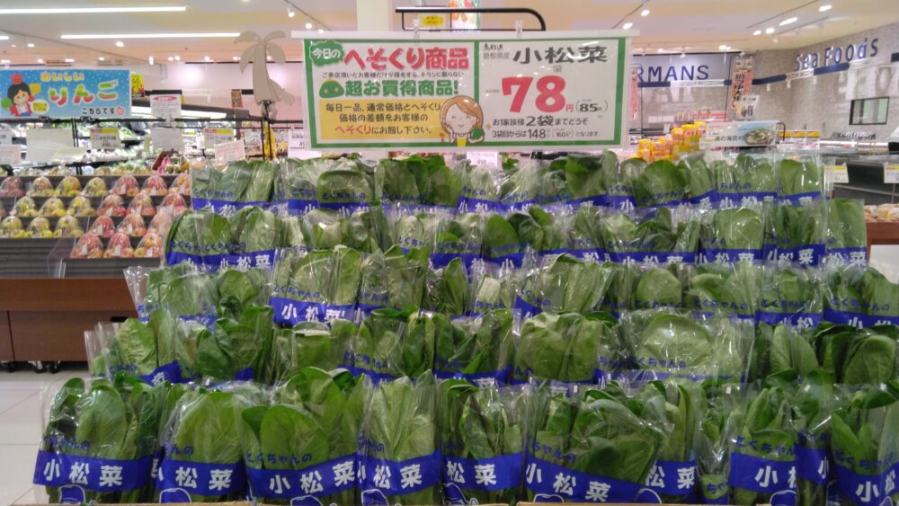 東川津店本日のへそくり商品は小松菜です。炒め物やおひたしなどにどうぞ!