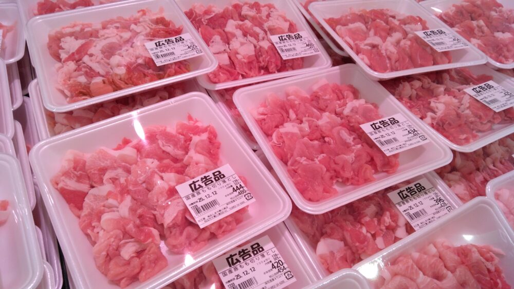 本日みしまや東川津店精肉コーナーからのおすすめは、国産豚モモ切り落としが100g134円(税込価格149円)と、お買い得となっております!是非お早めにお買い求めください!