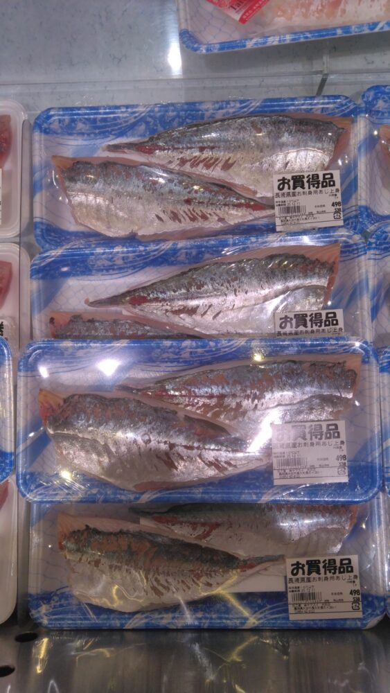 こんにちは、大田長久店です。本日のお魚コーナーからのおすすめ商品は、お刺身用アジ上身です。本日お刺身用アジ上身1パック本体価格498円 税込価格538円で販売中です。