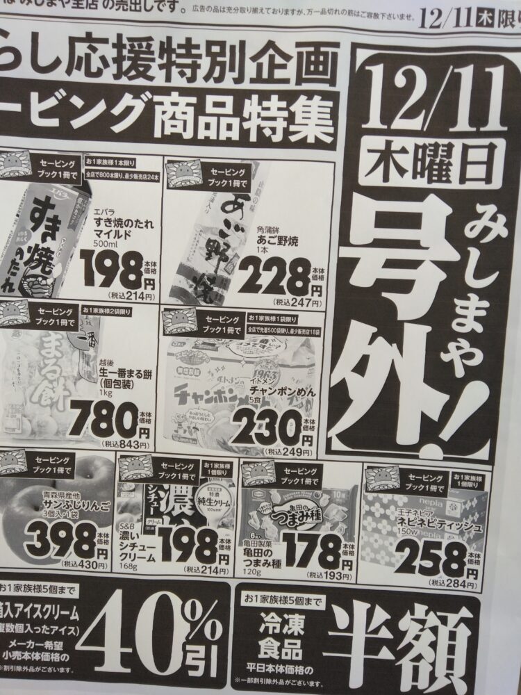 おはようございます。本日は全店号外チラシ!あれも、これもお買い得です。是非お越しください。