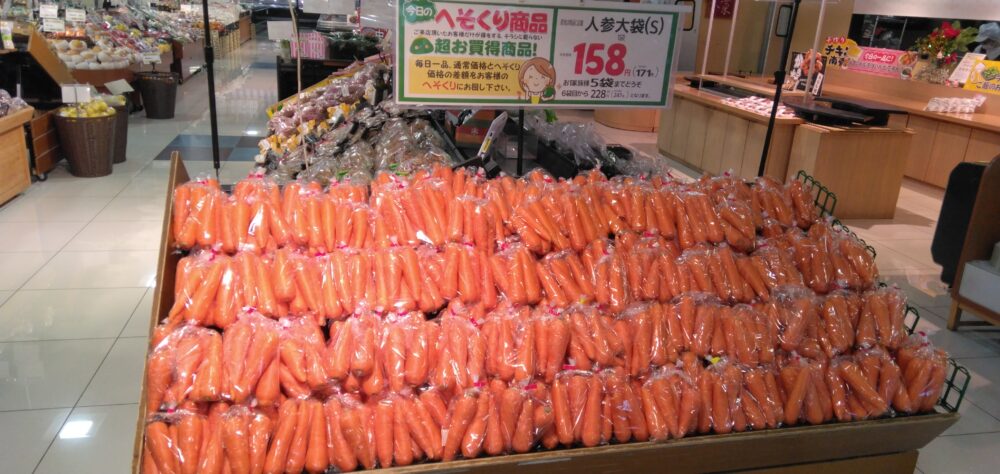 こんにちは、田和山店農産部門です。本日のおすすめは人参大袋です!1袋5本入りで大変お買い得でございます!煮物やシチューなどにいかがでしょうか。ぜひお買い求めくださいませ。