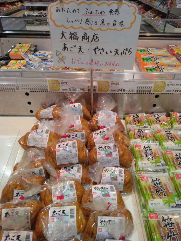 こんにちは、春日店日配です。今日のおすすめ品は大福商店あご天と野菜天です。春日店で1番売れている大人気の天ぷらです!そのままでも美味しいですが、今は何と言ってもおでん!出汁が染み込みふわふわの食感になります。この機会に是非お買い求めくださいませ。