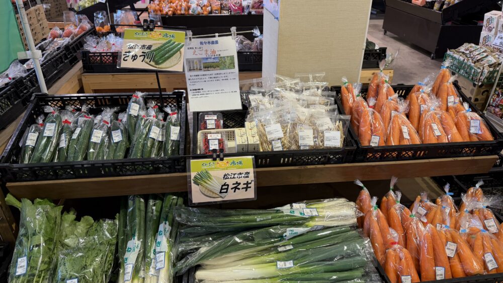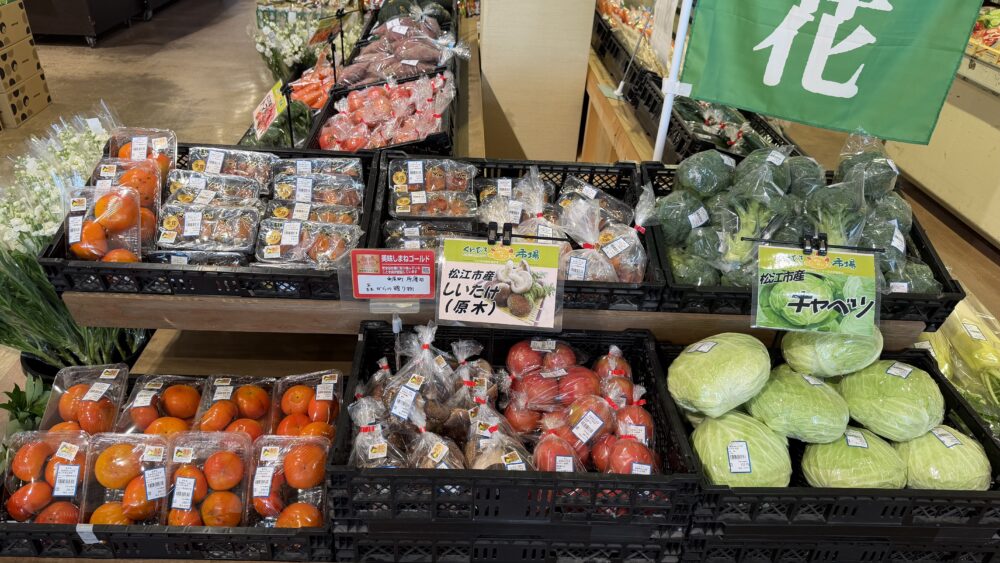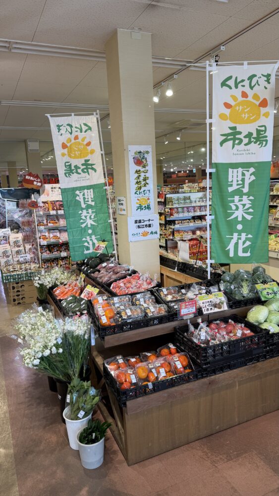 本日、みしまや学園店にJAくにびき産直コーナーがオープンしました! 安心安全な地元松江市産の野菜、果物、花、味噌等豊富に取り揃えておりますので、ぜひ学園店でお買い上げください。