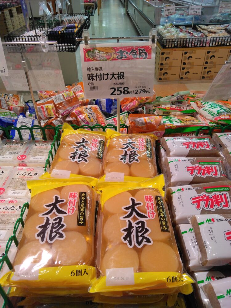 時間がかかってしまう、おでん・煮物に味付け大根はいかがでしょうか?本日のおすすめ商品です。ぜひご来店お待ちしております。