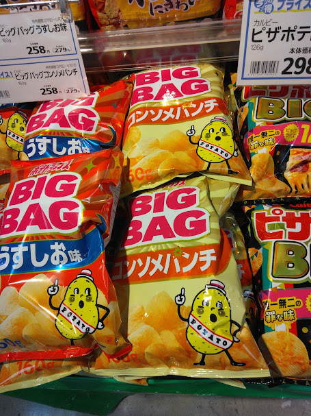こんにちは、中央店です。今日のおすすめは、カルビーの大袋ポテトチップスです!うすしお味、コンソメパンチ、ピザポテトがお買い得です。クリスマスや忘年会などみんなで、シェアしませんか?