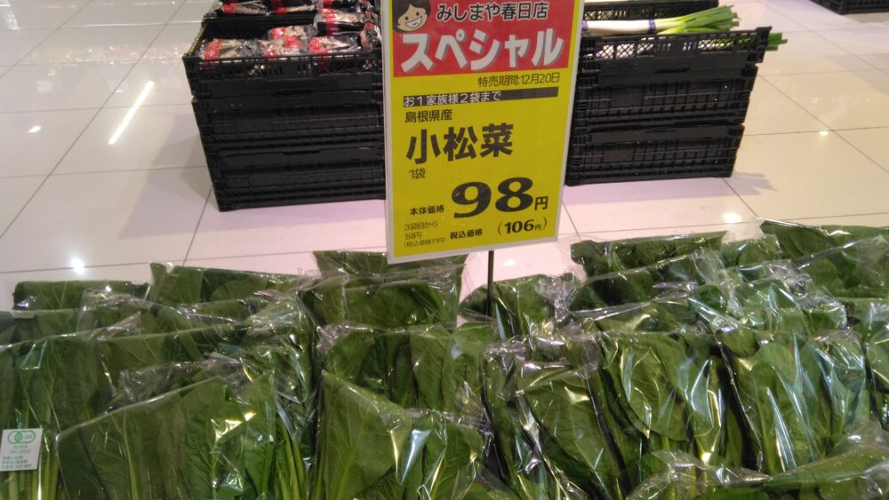 おはようございます!みしまや春日店農産コーナーです。本日のおすすめ品は、島根県産小松菜です。お1家族2袋まで98円、3袋目から158円です。是非お買い求めくださいませ!