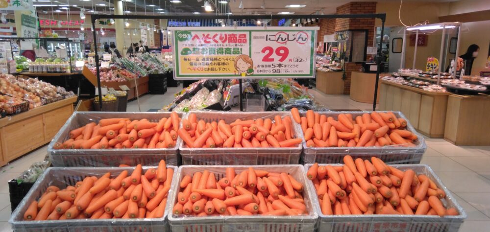 こんにちは、みしまや田和山店農産部門です。本日のおすすめは【にんじん】です。様々な料理につかえる万能食材です。「ん」のつく食べ物を食べると運をよびこむとされています。にんじんを食べて運を呼び寄せてみてはいかがでしょうか。みしまや田和山店では他にも「ん」のつく食べ物を取り揃えております。ぜひお買い求めくださいませ。