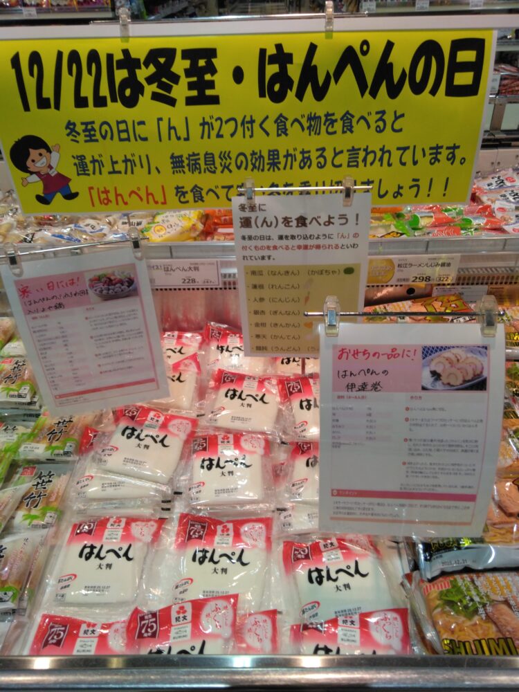 おはようございます。春日店日配です。明日は冬至!そしてはんぺんの日でもあります。冬至に「ん」のつく物を食べると幸運が得られると言われています!はんぺんを食べて寒い冬を乗り切りましょう!