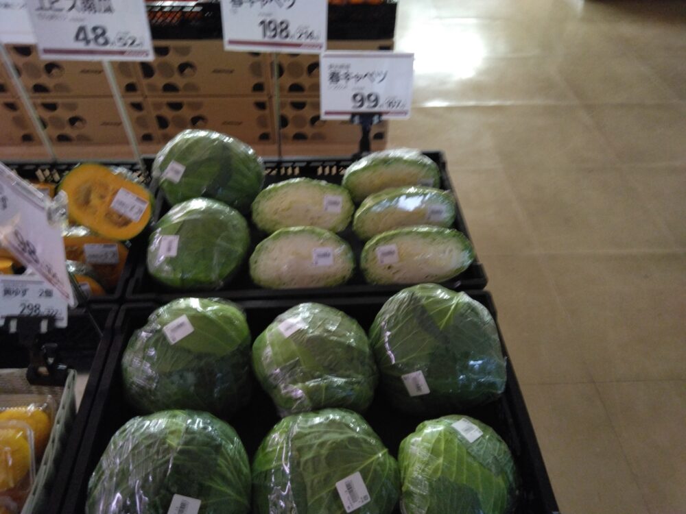 こんにちは八束店です。本日は春キャベツをおすすめします。キャベツと比べると柔らかく、炒め物や漬け物などにおすすめです。
