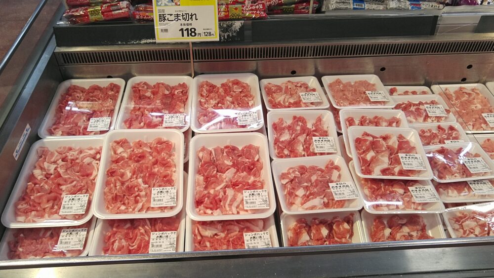 本日、精肉コーナーでは、国産豚こま切れがおすすめです。炒め物や豚汁にいかがでしょうか。豚汁にそのまま使えるだし入りの具も便利ですよ。