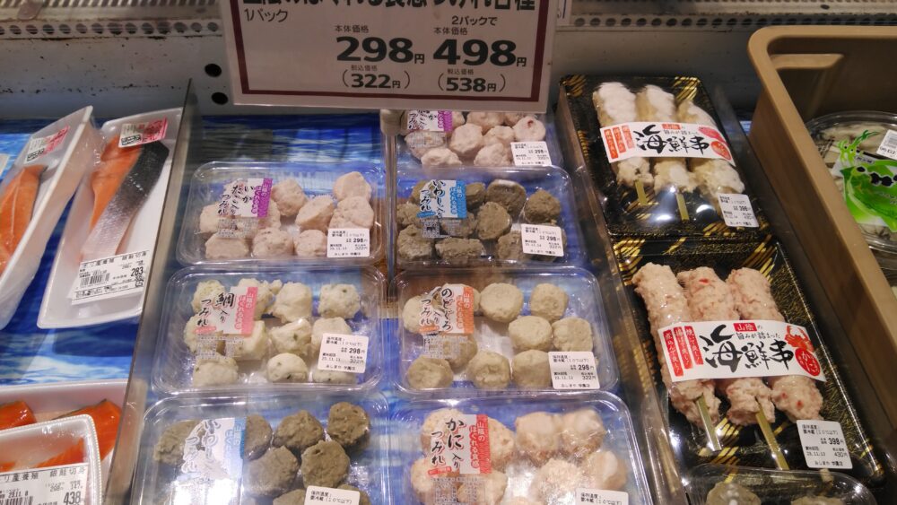 今週の鮮魚コーナーからのおすすめは、かねた食品の山陰のほぐれる食感のつみれです。 イワシ、ノドグロ、たい、かに、いかたことおでん、鍋材料にぴったりです。1パック298円(税込322円)2パックで498円(税込538円)とお買得になってますよ。