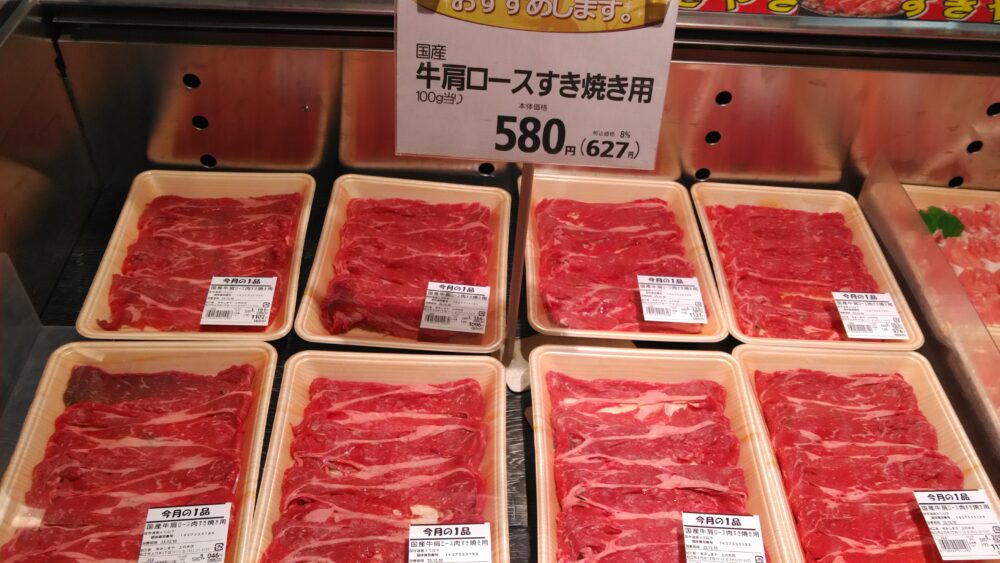 本日精肉コーナーからのおすすめ商品は、国産牛肩ロースすき焼き用です。朝晩寒い最近ですが、美味しい国産牛とお野菜たっぷりのすき焼きはいかがでしょうか?是非お立ち寄りお買い求めくださいませ!