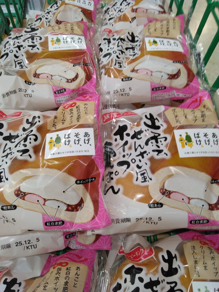 テレビ放送中。松江市とタイアップ・マツヤの出雲ぜんざいホイップパン入荷しております。ぜひお買い求めくださいませ。