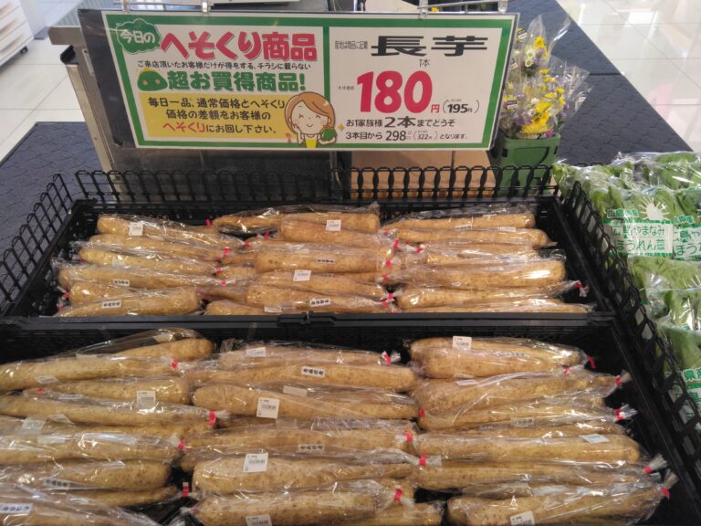 こんにちはみしまや雲南三刀屋店です。 本日のへそくりは長芋です! 今の季節ならお好み焼きに入れて、フワフワにして食べるのもいいですよ。 ぜひお買い求め下さいませ!