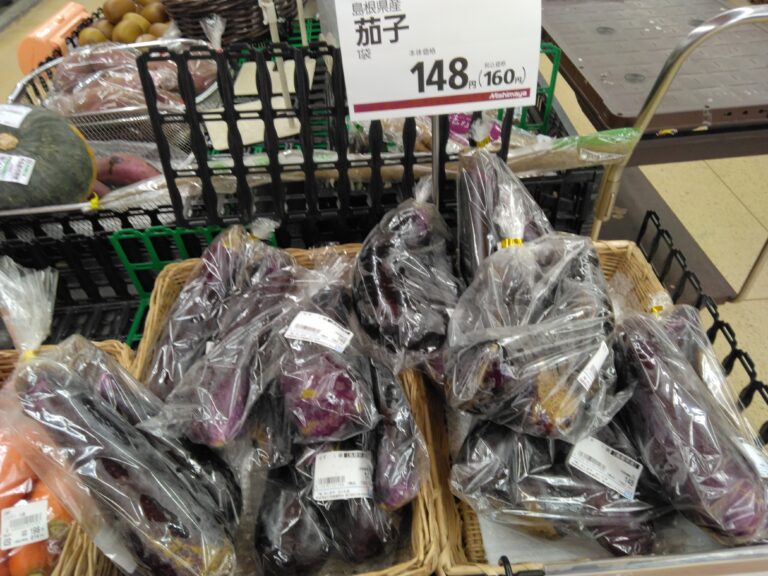 本日のおすすめは、なすです、炒め物、煮物、汁物、漬け物、煮びたしなどにはいかがでしょうか、ぜひお買い求めくださいませ。