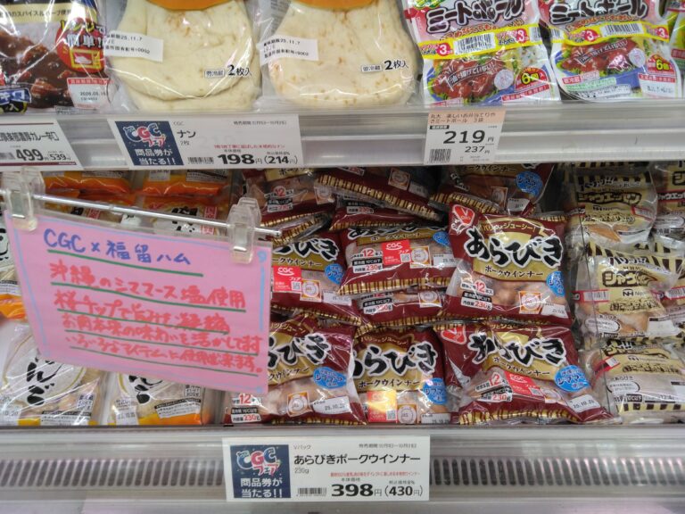 こんにちは八束店です。今日はCGCポークウインナーをおすすめします。焼いて食べるとパリパリ食感でご飯と一緒に食べるとてもおいしいです。朝食に、お弁当にどうぞ!今月はCGCフェア開催中です。