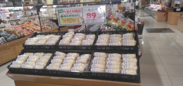 こんにちは、田和山店農産部門です。本日のおすすめはえのき茸です。味噌汁や鍋にいかがでしょうか。ぜひお買い求めくださいませ。