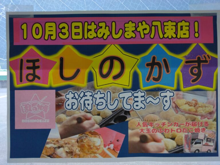 こんにちは!明日は大人気たこ焼きやさんの『ほしのかず』さんが八束店に来られます!!お昼ご飯に、おやつにいかがでしょうか?? 是非お越し下さいませ!!