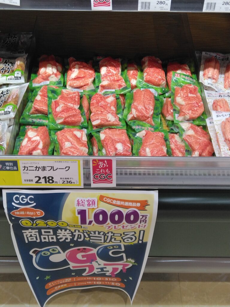CGCフェア開催中!本日のおすすめはカニかまフレークです。サラダ・天ぷら・かに玉・メニューいろいろ!是非お立ち寄り下さい。