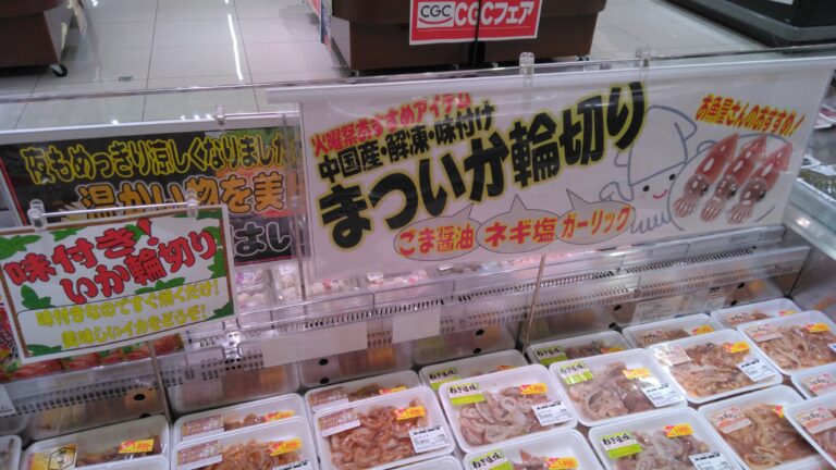 こんにちは!みしまや東川津鮮魚コーナーです!本日は鮮魚コーナーの先頭にておすすめ品を販売中!焼くだけ便利なまついかを使用した味付けいか輪切りとなっております!今夜のごはんのお供にぜひいかがでしょうか?お待ちしております!