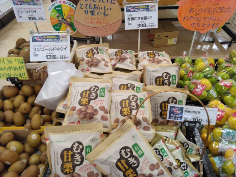 こんにちは八束店です。今月はCGCフェア開催いたしております。今日はむき栗をおすすめします。皮がむいてあるから手間要らずです。お酒のおつまみに、栗ご飯にしてもおいしいです。今が旬の栗をお楽しみください。